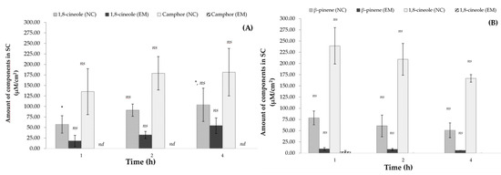 Amount of components in stratum corneum for (A) R. officinalis and (B) L. dentata at different times of skin contact (mean ± SD, n = 5). * Indicates significant differences p < 0.05 compared with 1,8-cineole in NC at 4 h. ns: not significant, nd: not detectable.