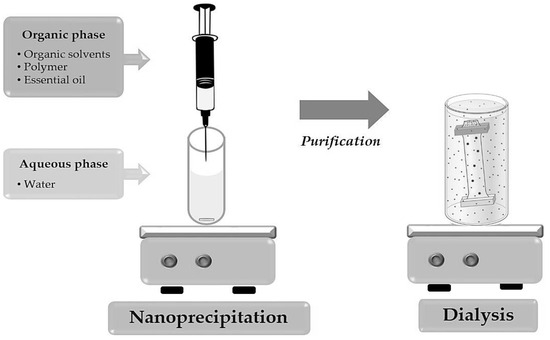 EO-loaded nanocapsules (NC-EO) were obtained by the nanoprecipitation method by Fessi et al. [18]. Briefly, an organic phase (OP), with 15 mL of solvent mixture (acetone:isopropyl alcohol (1:1)), 450 mg of Eudragit® EPO, and 225 mg of EO-R. officinalis or EO-L. dentata, was incorporated into an aqueous phase (AP) of 20 mL of milliQ water under moderate magnetic stirring (125 rpm). The organic solvent mixture was removed by the dialysis technique (Figure 5). For this, the NC-EOs were placed on a regenerated cellulose membrane, under constant stirring at 350 rpm for two hours at 25 °C [51]. NPs without EOs (NP-w/o) were prepared for use as blank control samples in biological assays.