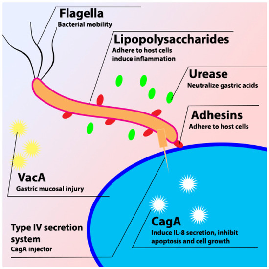 H. pylori is a Gram-negative spiral bacterium that is found in the human stomach and is associated with gastric ulcer and advanced gastric cancer [2,23,24]. The infection of H. pylori shows no symptoms in most cases, but it depends on the immune response of the individual and the severity of the syndrome. Most symptoms of H. pylori infection are correlated with the gastric ulcer and inflammation in the gastric tissue [25]. H. pylori is considered a special bacterium due to the virulence factors (Figure 1) that help to colonize in the human stomach, such as VacA, CagA, urease, LPS, and different kinds of adhesins [3].
