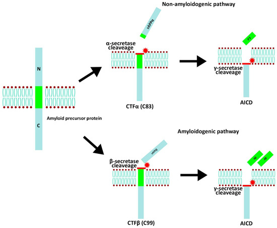 AD is a complicated disease. Its initiation and progression into dementia are associated with Aβ and NFT formation [58]. Aβ is a peptide, consisting of 42 amino acids derived from APP [59]. In a normal pathway (Figure 2), APP is cleaved by α-secretase activity producing a large soluble fraction called sAPPα and αCTF, which further cleaved by the activity of γ-secretase, producing AICD and a protein fragment called p83, which rapidly degraded [60]. Aβ is cleaved from APP by β-secretase, and γ-secretase by the amyloidogenic pathway (Figure 2), releasing C terminal peptides that tend to aggregate into oligomers and fibrils to form the senile plaque in the brain [61]. Aggregates of Aβ can cause loss of synaptic plasticity and induce neuronal cell death [62]. The ratio of Aβ 42/40 is a critical point of AD pathogenesis due to its more hydrophobic properties, causing it to be more prone to form oligomers and plaques [60].
