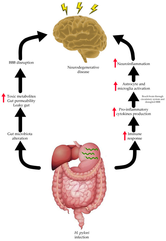 Alteration of the gut microbiome composition or so-called gut dysbiosis could lead to increased bacterial amyloid accumulation and intestinal innate immunity response, which induces systemic neuroinflammation, one of the hallmarks of AD [102]. The imbalance of the gut microbiome is related to increased gut permeability and gut barrier dysfunction, which causes toxic metabolites, bile acids, and pro-inflammatory cytokines to enter the circulatory system. The circulating toxic metabolites can reach the CNS and further cause leakage of the blood–brain barrier (BBB) and induce neuroinflammation due to microglia and astrocyte activation [103]. Doulberis et al. propose a hypothesis on how H. pylori might directly affect the CNS in three different ways: through the oral–nasal olfactory pathway, blood circulation by infecting monocytes and passing through the disrupted BBB, and the retrograde GI tract neural pathway [104].