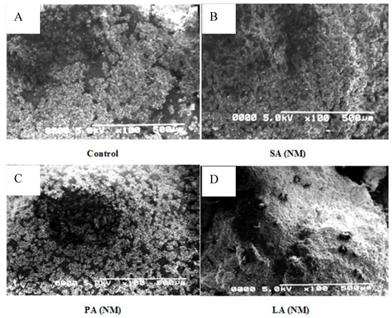 To evaluate the morphological changes, scanning electron microscopy (SEM) provides a comprehensive view of concerned changes in the shapes and structures of materials, especially nanoscale materials. Figure 2A–D shows SEM images of the control sample as well as the resulting complexes (ALNs). SEM scans indicate sizes ranging from 50 to 200 nm and from 100 to 500 nm for the control sample and all ALNs, respectively (with 0.8% fatty acids and 6% starch). Yan et al. [16] reported a 500 nm mean size for Cyperus esculentus starch–palmitic acid complex nanoparticles (with 0.4% palmitic acid to 4% starch) and reported an increase in particle sizes from 500 to 567.2 nm when hydrolysis time was extended, suggesting an increase in amylose content. The larger size of the amylose–lipid nanomaterial may have a slower degradation rate, which indicates sustained release of encapsulated molecules [17]. The SEM showed a granular spherical round shape of our control sample having sphere crystallites on its surface. The control sample exhibited granular structures with spherical, round-shaped spheres at the surfaces, with sphere crystals [18]. Guan et al. [19] found that the size and shape of starch granules have a significant impact on determining the degree of substitutions, particularly in the crystalline regions of the starch helical structures that facilitate the esterification of OH groups. The SEM images of SA-NM revealed that the granular structures of starch were no longer present owing to the binding of the fatty acid, resulting in the appearance of a solid, unbroken matrix structure of SA(NM). It is proposed that the mechanism involved in this process entails the breaking of hydrogen bonds in the helical structures of starch by stearic acid. This leads to the appearance of an intact and strong matrix structure [20]. This complex constitutes a smaller number of crakes and lamellae while no spherulites have been seen, which indicates a strong incorporation of the acid. The SEM image of PA(NM) (B), however, shows a granular structure without any matrix composition. It seems that the complex has somehow been affected by the enzymatic hydrolysis process and the fatty acid has not been fully incorporated, which can also be observed in the IR spectrum of PA(NM). Figure 2D corresponds to the SEM of LA(NM), which shows an intact solid matrix structure with a larger surface area having spherulites on its surface. The smoothness of the matrix surface is an indication of the formation of nanoscale material as well as the full incorporation of acid in the starch molecules [21]. SEM images of hydrogels formulated from each ALN show the morphology of amylose–lipid nanocomposite materials. PA hydrogel appears spherical with polydispersed particle size varying approximately from 200 to 350 nm in diameter with relatively smaller pores, approximately 50–100 μm sizes. LA hydrogels displayed larger spherical particle sizes varying approximately from 300 to 600 nm and relatively larger pores, approximately 200–250 μm sizes. SA hydrogel has a distinct morphology from other samples, with hard clumps of amylose–lipid networks firmly packed with a smaller number of pores having approximately 100–250 μm sizes. Its shape could be attributed to the hydrogels being stored at low temperatures prior to image analysis [22].