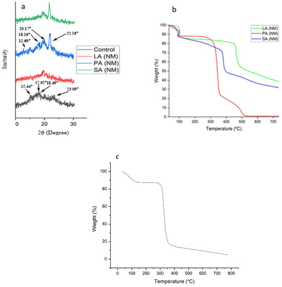 The thermal and degradation properties of control and nanomaterial complexes were investigated via TGA (Figure 3b). The initial weight loss at temperature ranges from 100 to 125 °C may have been due to the evaporation of absorbed water molecules [26]. All kinds of samples, such as SA(NM), PA(NM), and LA(NM), including a control sample of starch, exhibited the same kind of behavior and showed a thermal event below 125 °C. The control and nanomaterial complexes both showed three-stage weight losses below 700 °C. The first major loss occurred due to the evaporation of water in the range of 35–125 °C, which is usually observed near 100 °C. The second major weight loss was found to be a major one with maximum percent loss for both the control and nanomaterial complex in the temperature range of 270–460 °C. The remaining weight loss was observed in the range of 460–640 °C [15]. These other two weight losses occurred due to the decomposition of starch amylose and amylopectin in the control and nanomaterial complexes [27]. Moreover, it is possible to see in the TGA curves that nanocomposite material complexes exhibited more stability compared with the control. The observed sample variance could be attributed to the possible inclusion of fatty acids within the starch structures. LA(NM) showed maximum stability because of its larger incorporation inside starch helices due to the short chain, which ultimately formed stronger ester linkages [28]. Also, the crystallinity of the resulting ALN could enhance the stability as has been observed in SA(NM) where the large-chain stearic acid provides extra crystallinity to the material. PA(NM) was not stable compared with both SA and LA(NM).