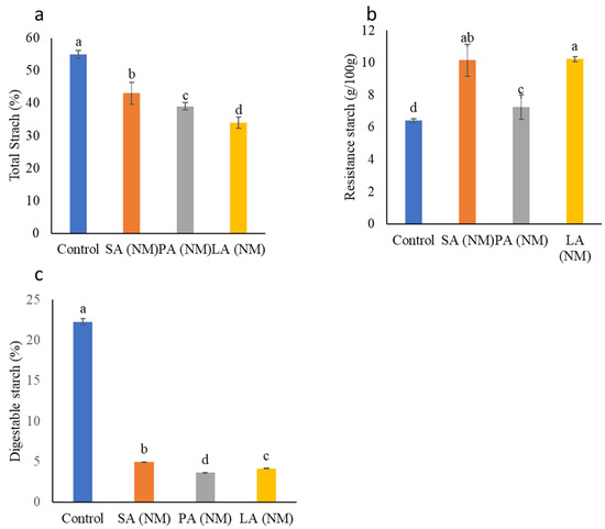 Amount of total starch (a), resistance starch (b), and digestible starch (c) of ALN estimated on the dry-weight basis. Different characters a,b,c and d represent significant differences (p ≤ 0.05). The letters a,b,c and d each signify statistically significant distinctions (p ≤ 0.05) These comparisons are articulated with regard to the observed differences in significance between the control and experimental outcomes.