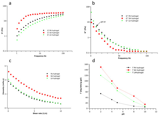 Top—Storage modulus, loss modulus, and flow curves of (a–c) of PA, SA, and LA hydrogels as a function of frequency performed at a fixed strain of 10% and 25 °C temperature maintained. Bottom—Flow behavior of PA, SA, and LA hydrogels. (d) Anthocyanins (Ant) uptake capacity Γ (mg and/g gel) of amylose–lipid nanocomposite hydrogels as a function of pH.