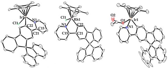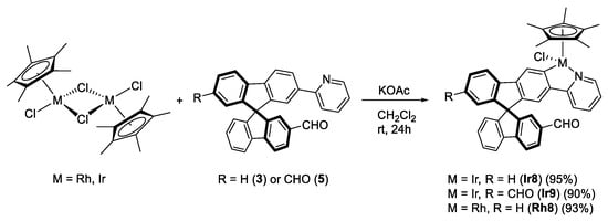 3.3.1. Synthesis of [MCp*Cl(2-py-SBF)] (M = Rh (Rh6), Ir (Ir6)), and [MCp*(OCOCH3)(2-py-SBF)] (M = Rh (Rh7), Ir (Ir7))