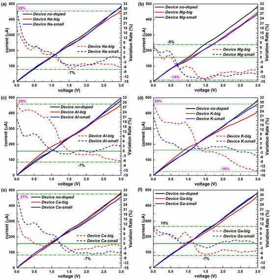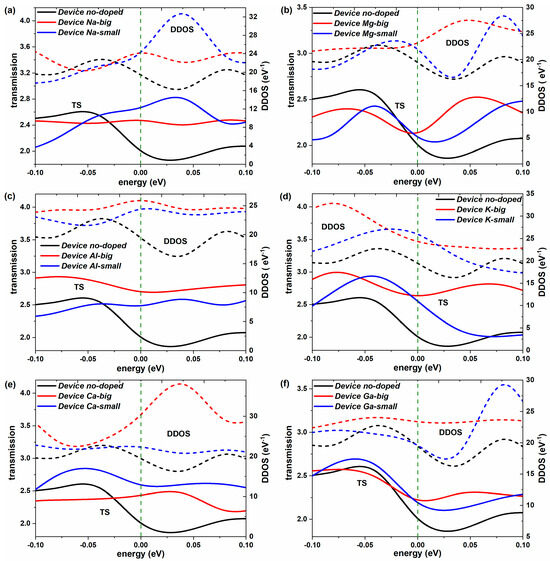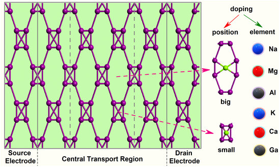 | Dopants | Doping Site | Changes in Con (G0) | Variation Rate (%) | Changes in TS | Variation Rate (%) | Changes in DDOS (eV−1) | Variation Rate (%) |