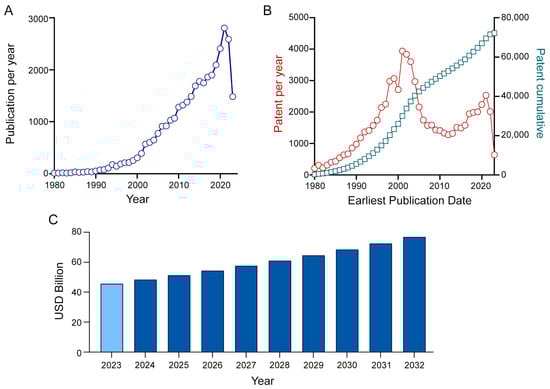 (A) The number of scientific publications per year (from 1980 to 2023) about peptides as therapeutic agents. (Source Scopus. Query using ‘peptide’, ‘drugs’, ‘therapeutic agent’ as keywords). (B) The number of patents per year (in red) and cumulative (in teal) (from 1980 to 2023) about peptides as therapeutic agents. (Source Espacenet. Query for patent applications belonging to cooperative patent classification CPC: A61K38). (C) Peptide therapeutic market size in 2023 and forecasted up to 2032.