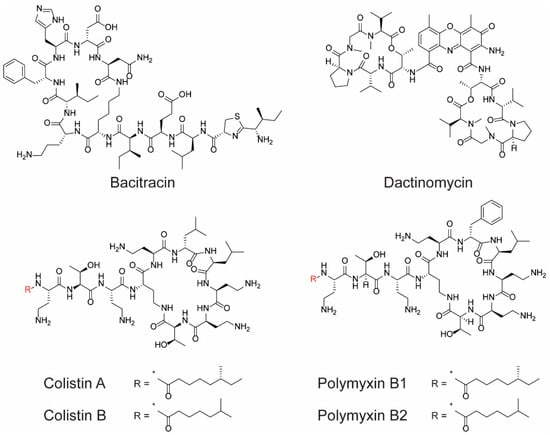 Chemical structure of bacitracin, dactinomycin, colistin A and B, and polymyxin B1 and B2.