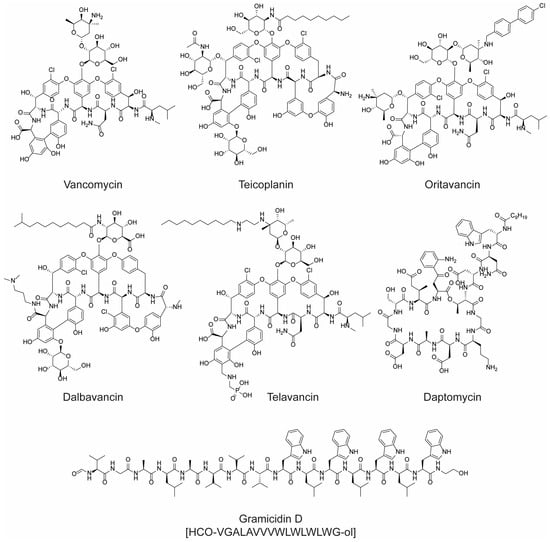 The chemical structure of some marketed AMPs. For gramicidin D and teicoplanin, only the most abundant components of the clinically used mixtures are shown.