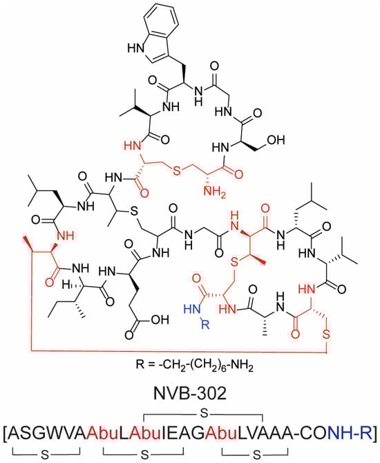 Among the antimicrobial cyclic peptides, lantibiotics warrant mention. These represent a novel class of polycyclic natural peptides distinguished by the inclusion of atypical amino acids, notably lanthionine and methyllanthionine, which are cyclized through the formation of a thioether-linker [28]. Lantibiotics are synthesized by Gram-positive bacteria as a defensive strategy against rival Gram-positive bacteria. They predominantly exert their antimicrobial activity by targeting the bacterial cell membrane or inhibiting cell wall synthesis. Given their distinctive structure and mechanism of action, lantibiotics emerge as promising solutions to combat antibiotic-resistant bacterial infections. NVB-302 (Figure 4) is the only lantibiotic that entered a phase I clinical trial for the treatment of Clostridioides difficile gut infections [26]. Nevertheless, the clinical trial of NVB-302 was discontinued in 2018, whilst no detail about the outcomes of the study have been disclosed yet [29]. However, several companies have invested in the development of new lantibiotic peptide compounds as broad-spectrum antibacterial agents using novel peptide synthesis platforms.