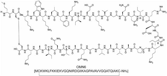 Lastly, OMN6 (Figure 7), a pioneering antimicrobial 40-amino acid cyclic peptide based on cecropin A, produced using advanced genetic-engineering techniques, has gained attention for its potential to combat multidrug-resistant Gram-negative bacteria, such as carbapenem-resistant Acinetobacter baumannii. Clinical trials for OMN6 are ongoing in the Netherlands [32].