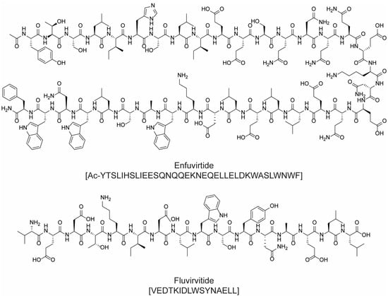 As a result of extensive research efforts, antiviral therapies and means of prevention of human immunodeficiency virus (HIV) infection and acquired immune deficiency syndrome (AIDS) have been developed in the past 20 years. Some of the agents developed for the treatment of HIV infection have been shown to inhibit other viruses as well, and the innovative approaches taken in the development of antiretroviral therapy have been applied to develop numerous treatment strategies [39]. Enfuvirtide is the pioneering peptide active against HIV (Figure 8), which was approved in the United States of America in 2003. In detail, it is a biomimetic peptide composed of 36 amino acids, which acts by preventing the fusion between the virus and the target cell, thus avoiding the intracellular uptake of the virus and the subsequent infection.