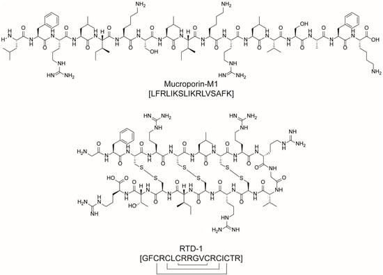 Chemical structures of mucroporin-M1 and RTD-1. The amino acidic sequence (using the one letter code) is reported in squared brackets. Disulphide bonds connecting cysteine residues are represented using connection lines in the AA sequence description.