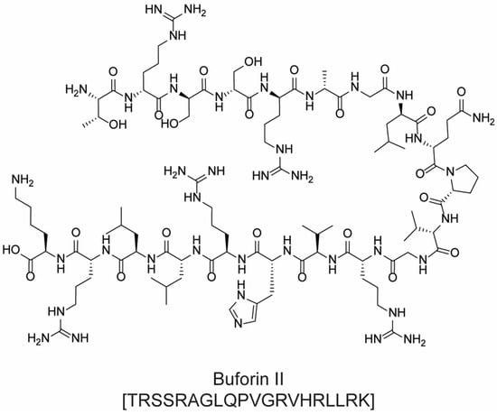 For example, cationic ACPs exploit electrostatic forces to interact directly with the outer membrane of cancer cells, which is more negatively charged than the surface of healthy cells. Accordingly, such peptides are mainly composed of basic and hydrophobic amino acids, which at a physiological pH, give an overall positive charge and amphipathic properties. Upon interaction with a biological membrane, these peptides can adopt different structures (i.e., α-helical, β-sheet, or extended), all of which have both a cationic face and a hydrophobic face. The amphipathic nature of such molecules allows their adhesion to the cell membrane and the subsequent translocation into the interior of the cells (in fact, they are sometimes referred to as “cell-penetrating peptides”). Their mechanism of action can be either direct or indirect: in the first case, cell death is caused by irreparable membrane damage and cell lysis, whereas in the second case, cancer cells are killed by intervention in cell death pathways, signal transduction pathways, and/or the cell cycle [48,53]. For example, magainin II (Figure 12) [54], lactoferricin B (Figure 12) [55], and the pleurocidin-family peptides NRC-3 and NRC-7 [56] act through a direct mechanism; pardaxin (Figure 13) [57] and buforin IIb (Figure 14) [58] induce apoptosis by different mechanisms.