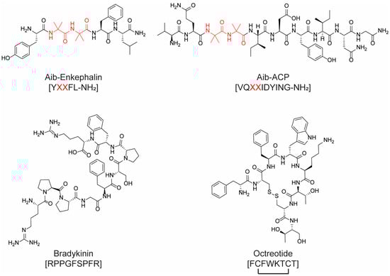 Chemical structures of some of the peptides synthesized in the literature using greener solvents. X = 2-Aminoisobutyric acid (Aib), highlighted in red in the structures.