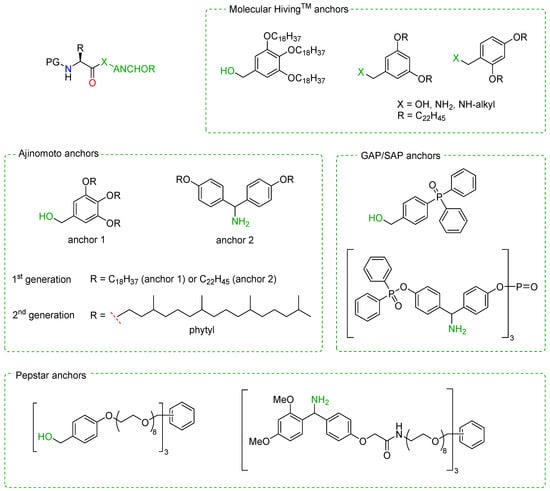 - Okada, Y.; Suzuki, H.; Nakae, T.; Fujita, S.; Abe, H.; Nagano, K.; Yamada, T.; Ebata, N.; Kim, S.; Chiba, K. Tag-Assisted Liquid-Phase Peptide Synthesis Using Hydrophobic Benzyl Alcohols as Supports. J. Org. Chem. 2013, 78, 320–327. [Google Scholar] [CrossRef]