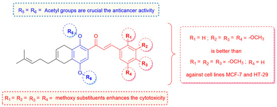 In terms of the structure–activity relationship, these findings underscore the exceptional cytotoxicity of the trimethoxylated 1,4-diacetylated CBHQ compounds 5e and 5f against both cancer lines. Compound 5f, in particular, displayed the highest potency against the HT-29 line (pIC50 5.22), comparable to that of the reference drug doxorubicin (pIC50 5.39). This underscores the pivotal role played by the -OCH3 and 1,4-COCH3 substituents, which significantly influence the cytotoxicity exhibited by CBHQs 5e–f derivatives (Figure 2). These results align with those of previous reports identifying various methoxychalcones with anti-tumor properties, attributed to the electron-donating properties of the aryl ring of chalcones. The presence of the methoxy group enhances the anticancer activity of these structures [46,47,48].