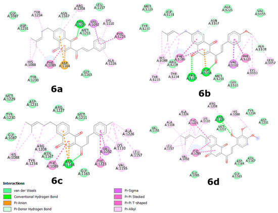 Plotted 2D maps of H-bonds and hydrophobic interactions of CNQ 6a, 6b, 6c, and 6d with c-MET residues. Van der Waals, Pi–Anion, Pi–Sigma, Pi–Pi stacked, and Pi–alkyl are considered hydrophobic interactions.