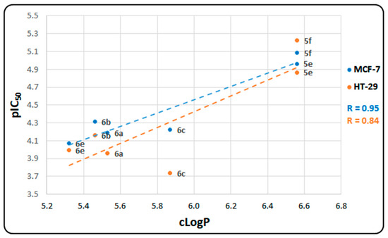 The antiproliferative activity of the new derivatives 4a–f, 5e–f, 5′b–d, and 6a–e was evaluated on MCF-7 and HT-29 cancer cell lines using a CellTiter 96® AQueous One Solution Cell Proliferation Assay (MTS). The results, presented in Table 1, are expressed as the half-maximal inhibitory concentration (IC50 ± standard deviation) for cell proliferation inhibition, along with the corresponding -log10 values (pIC50).