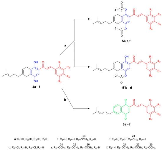 The acetylation of the phenolic groups in the CBHQ 4a–f hybrids was carried out using acetic anhydride in pyridine [45]. As depicted in Scheme 2, this process yielded 1,4-diacetylated derivatives 5e and 5f, as well as 4-monoacetylated derivatives 5′b, 5′c, and 5′d. The formation of these derivatives resulted from the stabilization of the proton through intramolecular hydrogen bonding with the adjacent carbonyl group. These compounds were synthesized with favorable yields ranging from 85% to 95%, except for derivative 5a, which could not be obtained in pure form.