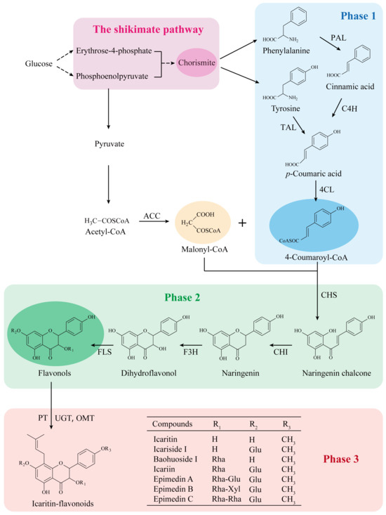 In phase 1, phenylalanine is converted to cinnamic acid catalyzed by phenylalanine ammonia lyase (PAL); cinnamic acid is then catalyzed by cinnamate-4-hydroxylase (C4H) to produce p-coumaric acid, and tyrosine is converted to p-coumaric acid by tyrosine ammonia lyase (TAL) [100]. Then, 4-coumarate CoA ligase (4CL) converts p-coumaric acid to 4-coumaroyl-CoA. Another precursor, malonyl-CoA, is mainly derived from acetyl-CoA by acetyl-CoA carboxylase (ACC), and acetyl-CoA is often produced from the classic glucose metabolic pathway. In phase 2, one molecule of 4-coumaryl-CoA and three molecules of malonyl-CoA are condensed by chalcone synthase (CHS) to form naringenin chalcone (a C6-C3-C6 backbone unit for all flavonoids) [97,100]. Subsequently, naringenin chalcone is converted to naringenin by chalcone isomerase (CHI) to complete ring closing. Naringenin is transformed to dihydroflavonol by flavanone 3-hydroxylase (F3H). Flavonol synthase (FLS) further converts dihydroflavonol to flavonols. In phase 3, isopentenyl is added to flavonols by prenyltransferase (PT), and further modifications are carried out by various post-modification enzymes, such as UDP-glycosyltransferase (UGT) and O-methyltransferase (OMT), to produce a series of icaritin flavonoids, including epimedin A, epimedin B, epimedin C, icariin, baohuoside I, icariside I, and icaritin [96,97].