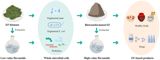 Biotransformation processes have demonstrated the ability to convert low-value flavonoids into high-value flavonoids. However, the production of natural products from plant biomass requires large amounts of arable land and labor-intensive cultivation. Metabolic engineering and synthetic biology methods have emerged as alternative, simple, and eco-friendly strategies for the production of high-value natural herb products [134,135]. Currently, microbial cell factories have been built to produce diverse natural products, such as artemisinic acid [136], opioids [137], and glycyrrhetinic acid [135].