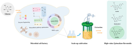- Wang, P.; Li, C.; Li, X.; Huang, W.; Wang, Y.; Wang, J.; Zhang, Y.; Yang, X.; Yan, X.; Wang, Y.; et al. Complete biosynthesis of the potential medicine icaritin by engineered Saccharomyces cerevisiae and Escherichia coli. Sci. Bull. 2021, 66, 1906–1916. [Google Scholar] [CrossRef]