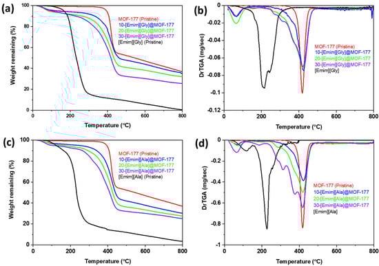 A thermogravimetric analysis of MOF-177 and the AAILs@MOF-177 composites was performed to monitor the thermal stability of the AAIL-supported MOF-177 composites from 25 to 800 °C in a nitrogen atmosphere. TGA thermograms of the composites along with those of pure AAILs and pristine MOF-177 are presented in Figure 1a–d. The thermograms of pristine [Emim][Gly] and [Emim][Ala] indicated that both AAILs were thermally stable up to 200 °C, but beyond that temperature, a sharp weight loss was observed, indicating a very rapid decomposition. According to the derivative weight loss profile shown in Figure 1b,d, it was found that the onset decomposition temperatures (Tonset) were about 215 °C and 225 °C, respectively, whereas the pristine solid support MOF-177 was much more thermally stable than the pristine AAILs, with onset decomposition temperatures (Tonset) of about 421 °C, in agreement with similar studies reported in the literature [36,37]. A little decrease in weight of around 2 to 4 wt.% was found for the composites at temperatures under 75 °C. This drop can most probably be attributed to the potential evaporation of any residual methanol (BP of 65 °C) that was employed during the synthesis of the composites. The thermogram of the composites revealed that the incorporated AAILs decomposed before the pristine solid support itself, as expected. However, note that there was no sharp decomposition of AAILs around their Tonset, but rather, a gradual decomposition over the temperature range from 250 to 400 °C, which continued until MOF-177 itself started to decompose, as displayed in Figure 1b,d. This gradual decomposition was more profound at higher loadings of AAILs, as observed for 30-[Emim][Gly]@MOF-177 (Figure 1b) and 30-[Emim][Ala]@MOF-177 (Figure 1d). This progressive breakdown could be attributed to the surface association that took place between MOF-177 and the incorporated AAILs.