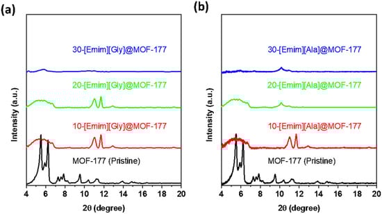 XRD profiles of pristine MOF-177 and the composites (a) Emim][Gly]@MOF-177 and (b) [Emim][Ala]@ MOF-177.