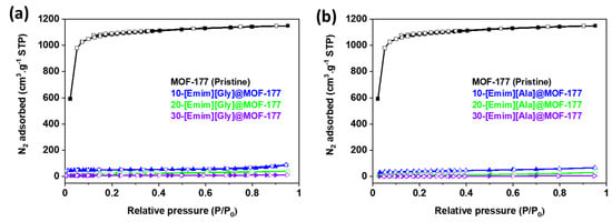 N2 adsorption–desorption isotherms at 77 K for unmodified MOF-177 and the composites (a) [Emim][Gly]@MOF-177 and (b) [Emim][Ala]@MOF-177. Filled and unfilled symbols represent adsorption and desorption isotherms, respectively.