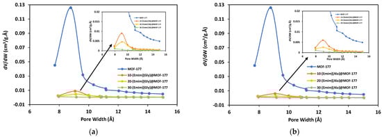 Pore size distribution for pristine MOF-177 and the composites (a) [Emim][Gly]@MOF-177 and (b) [Emim][Ala]@MOF-177.