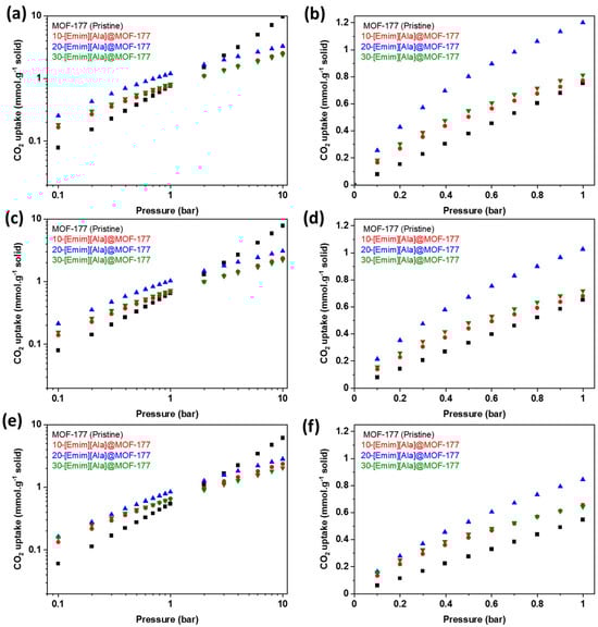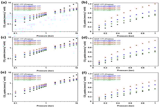 CO2 equilibrium adsorption capacity of [Emim][Gly]@MOF-177 composites at two pressure ranges (0–10 bar and 0–1 bar) and three temperatures, i.e., (a,b) 303 K, (c,d) 313 K, and (e,f) 323 K.