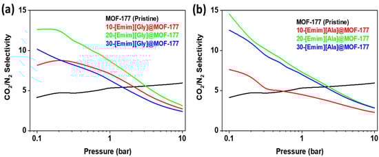 The encapsulated amino acid-base ionic liquids contributed to the enhancement of CO2/N2 selectivity. This improvement was observed at pressures below 2 bar. As previously discussed, it was proposed that the presence of amino acids leads to the formation of active chemical sorption sites for CO2, facilitating the creation of an N-C bond. This interaction is similar to that observed when CO2 interacts with an aqueous amine solution [46,48]. In our work, it resulted in additional CO2 capture, although the surface areas and pore volumes were reduced due to the addition of the ionic liquid. On the other hand, N2 did not have an affinity for the amino group as the adsorption was physical and depended on the available surface area. Hence, CO2 uptake was dominant at low pressure compared to N2 uptake, resulting in higher CO2/N2 selectivity. However, as the pressure increased, the physical adsorption sites also became determining factors of the adsorption capacity besides the active chemical adsorption sites in the sorbent. Consequently, the CO2/N2 selectivity of the composites decreased as the pressure increased and became lower than that of pristine MOF-177 at pressures above 2 bar.