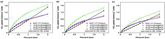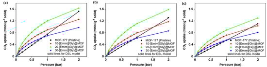 Fitting of the DSL model for MOF-177 and the [Emim][Ala]@ MOF-177 composites with different loadings of AAILs at (a) 30 °C, (b) 40 °C, and (c) 30 °C for pressures spanning from 0.1 to 2.0 bar.