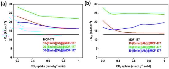 The enthalpy of CO2 adsorption (Qst) of the composites (a) [Emim][Gly]@MOF-177 and (b) [Emim][Ala]@MOF-177.