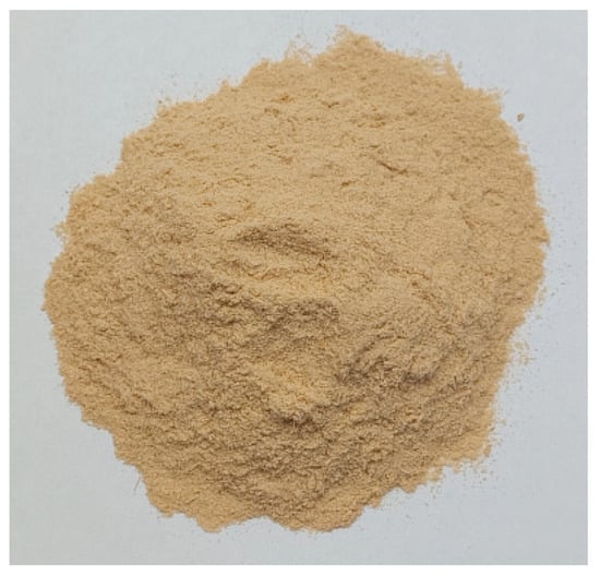 The pasta was made using CWF, which was replaced with MOH (Figure 2) at levels of 0, 5, 10, 15, and 20 g/100 g. The pasta-making process and parameters adhered to the procedure described in Biernacka et al. [25]. To start the dough preparation, the ingredients were measured and sifted to remove any lumps. All ingredients were then placed in the bowl of a KitchenAid planetary food processor, model T-5KPM5EER (Greenville, SC, USA). Because fiber absorbs water readily, the amount of water added to the dough had to be adjusted with increasing MOH levels. Specifically, 48.3, 51.7, 53.3, 56.7, and 60.0 g of water/100 g of CWF with MOH was used for P0, P5, P10, P15, and P20, respectively. The device formed the dough with the help of the rolling and cutting attachment (KitchenAid 5KSMPSA, Greenville, SC, USA). The tagliatelle had approximate dimensions of 2 mm in thickness and 5 mm in width. The prepared pasta was then hung on a KitchenAid 5KPDR pasta dryer (Benton Harbor, MI, USA) and placed in a climatic chamber (ICH 256, Düsseldorf, Germany) for 24 h at a temperature of 25 °C and 20% relative humidity. The drying process continued until the moisture content of the pasta reached between 11% and 12% wb. Drying the pasta took about 24 h. The pasta was stored in tightly closed polyethylene bags, without access to light and oxygen. The storage time is similar to that of commercial pasta, and equals a maximum 3 months.