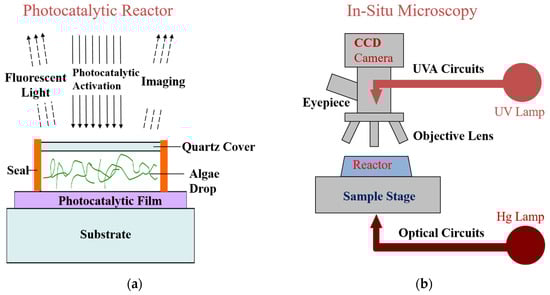 Photocatalytic disinfection was proven to be another potential route to solving blue algae blooms, thanks to the fundamental work of Matsunaga et al. in 1985 []. They found that photocatalytic disinfection could effectively disinfect the whole spectrum of microorganisms, including bacteria [], viruses [], and fungi []. For the treatment of blue algae and its related environmental problems, TiO2-based materials have been demonstrated to possess high photocatalytic inhibition activity for blue algae growth, and could photocatalytically degrade toxic cyanotoxins [,,,]. Immobilizing TiO2-based photocatalysts on appropriate substrates, such as fibers [], foams [], and membranes [], makes photocatalysis a more promising approach to the treatment of cyanobacteria-contaminated water bodies. To better understand the photocatalytic disinfection of blue algae, the in situ observation of changes in blue algae during the photocatalytic treatment process is essential, which could reveal its disinfection mechanism and may provide interesting findings in biophysics.
