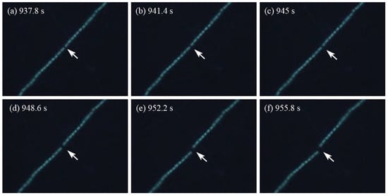 Figure 2 presents a series of images of an Anabaena sp. PCC 7120 chain exposed to the photocatalytic stimulus for various time intervals. Prior to the application of the photocatalytic stimulus, the Anabaena sp. PCC 7120 chain consisted of a large number of individual cells connected end-to-end. Most of the chains were long, continuous, and floating in the liquid medium with little movement. Within each chain, the distance between the adjacent cells was relatively constant. After the photocatalytic stimulus was applied for an extended period of time, the chain appeared permanently deformed and ruptured into multiple fragments. Figure 2a shows the emergence of a gap between two individual cells at the location indicated by the arrow. As the photocatalysis time continued, the gap became larger, as seen in Figure 2b–d, and eventually, the chain broke into separate pieces (Figure 2e,f). The chain rupture apparently occurred along the septum of the cyanobacteria. After the chain rupture, the cells in the broken pieces were still active, continuing to vibrate at a fast speed, as the photocatalytic stimulus remained in place. The dynamic process of the chain rupture was captured by the video camera mounted on the microscope and shown in Video S1.