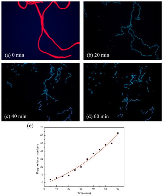 For the long Anabaena sp. PCC 7120 chains, the rupture occurred at multiple locations, though not necessarily at the same time, resulting in multiple fragments. As shown in Figure 3a, the field of view initially enclosed two long continuous cyanobacterial chains. At the beginning of the photocatalytic activation, the chains were deformed to assume different configurations (Figure 3b). After extended periods of photocatalytic treatment, the long, continuous chains broke into short fragments (Figure 3c,d). The longer the photocatalysis time was, the shorter the fragments were. Figure 3e demonstrates the chain/fragment numbers observed at different photocatalysis time intervals in one representative observation out of eight observations. It clearly demonstrates that the chain/fragment numbers increased generally with the increase in photocatalysis time, and the relationship between the fragment number, N, and the photocatalysis time, t, could be fit into an exponential function: