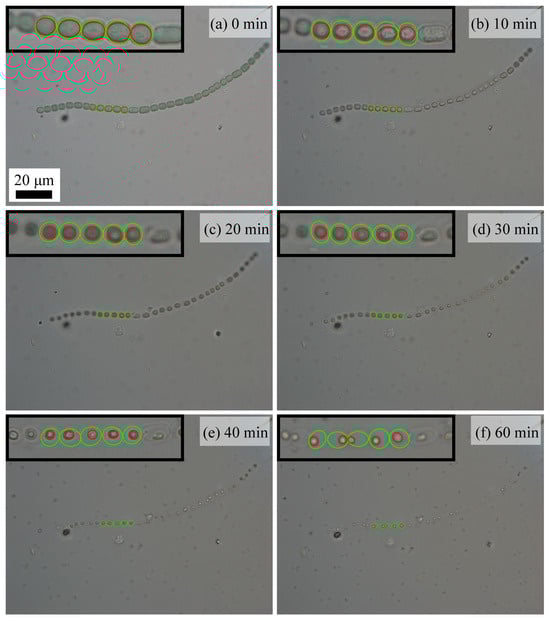 Optical observations of morphology changes in Anabaena sp. PCC 7120 treated with UVA on TiO2 film at (a) 0 min, (b) 10 min, (c) 20 min, (d) 30 min, (e) 40 min, (f) and 60 min at a magnification of 1000 times (The green circles indicated the cells chosen for the average apparent cellular area decreasing calculation, and the red circles indicated the protoplasm chosen for the average apparent protoplasm area decreasing calculation).