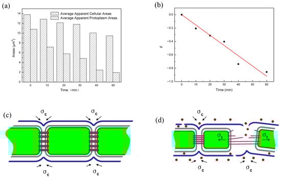 (a) The average apparent cellular areas and protoplasm areas at different time intervals during the photocatalytic treatment process. (b) The relationship between the cellular strain and the photocatalytic treatment time, t. (c) Schematic diagram of the chain structure. (d) Schematic diagram of the chain fracture mechanism during the photocatalytic treatment (Note: red dots represent reactive oxygen species, and the arrows indicate the stress directions).