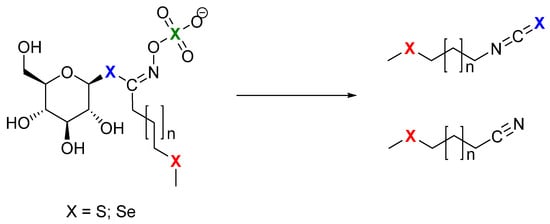 Black mustard (Brassica nigra) seeds grown on naturally Se-rich soils in the Punjab region of India, where the Se soil content ranges from 2 to 7 mg/kg, were studied by Ouerdane et al. (2013) [17]. Using HPLC ESI Orbitrap MS(/MS) and GC APCI TQ MS/MS for the extract analysis, among over 30 Se species, they detected the presence of “selenoglucosinolates”, namely glucoselenoibervirin and glucoselenoerucin, as well as their corresponding degradation products 3-(methylseleno)propylisothiocyanate and 4-(methylseleno)butanenitrile, i.e., 4-(methylseleno)butylisothiocyanate and 5-(methylseleno)pentanenitrile, respectively. To avoid confusion with selenoglucosinolates according to Bertelsen et al. [14], GSLs with Se in the side chain are suggested to be referred to as selenoMet-derived GSLs [8]. The presence of Se in the side chains is fully compatible with the definition of GSLs because they form isothiocyanates and not isoselenocyanates as hydrolysis products (Figure 1).
