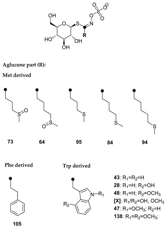 Glucosinolates (GSLs) are well-defined specialized plant metabolites containing sulfur and nitrogen which represent the molecular tags of plants from the Brassicaceae family. Generally, they are found in 16 families of the order Brassicales, as well as several plants outside of this order, such as the genus Drypetes (family Putranjivaceae, order Malpighiales) and Rinorea genus (family Violaceae, order Malpighiales) [8,9]. GSLs can be divided into three classes based on the structure of various amino acid precursors: aliphatic GSLs derived from methionine, isoleucine, leucine, or valine; arylaliphatic GSLs derived from phenylalanine or tyrosine; and indole GSLs derived from tryptophan. Only 90 of the 139 GSLs discovered in the plant kingdom have been thoroughly described by relevant spectroscopy techniques (MS, NMR) to date [10,11,12]. Se-biofortification influences GSL production with possible exchange positions of sulfur (S) by selenium (Se) in three places in the side chain, in thioglucose, and in the sulfate group (Figure 1) [7].