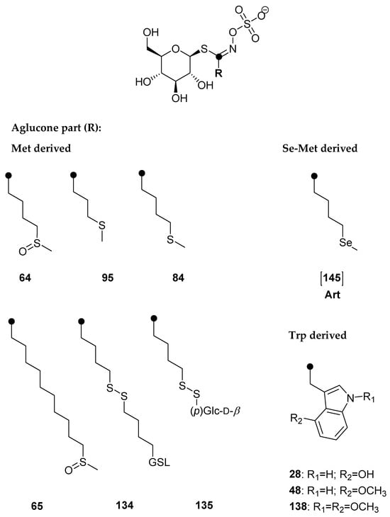 Matich et al. (2012) treated broccoli (B. oleracea var. italica), cauliflower (B. oleracea L.), and forage rape (B. napus) with elevated sodium selenate and examined them for the presence of organoselenides. Based on the analysis of broccoli and cauliflower florets, and the roots of forage rape, the discovery of putative GSL hydrolysis products using synthesized standards confirmed by MS and NMR, as well as by LC-MS analysis, three Se-Met artificially derived GSLs of the general type (methylseleno)alkyl GSL are accepted: 3-(methylseleno)propyl GSL (glucoselenoibervirin [144]), 4-(methylseleno)butyl GSL (glucoselenoerucin, [145]), and 5-(methylseleno)pentyl GSL (glucoselenoberteroin, [146]) [15]. This analysis showed that Se is preferentially incorporated into the methylselenyl moiety rather than the sulfate or β-thioglucose groups. A further Se-biofortification study by Matich et al. (2015) using HPLC-MS/MS tentatively indicated glucoselenoraphanin in broccoli (B. oleracea var. italica) florets with Se envisioned in the side chain and glucoselenonasturtiin in forage rape (B. napus) roots, but with Se, that could not be envisioned to be on the side chain, suggesting a selenoGSL sensu Bertelsen et al. [14,16].