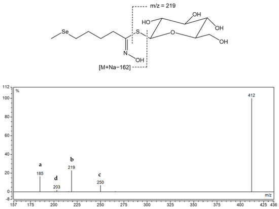 Structure of desulfoglucoselenoerucin d[145] and MS2 spectra of its sodium adduct. Fragment types observed, alone or in combination, in MS2 spectra desulfoglucosinolates in positive mode: a—Na+ adduct of anhydroglucose, C6H10O5 (at m/z 185) or an acyl derivative; b—Na+ adduct of thioglucose, C6H11O5SH (at m/z 219) or an acyl derivative; c—Loss of anhydroglucose (m/z 162) or an acyl derivative; d—Na+ adduct of glucose, C6H12O6 (at m/z 203) [28].