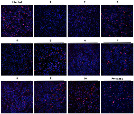 Effect of the tested compounds (1–10) in Vero CCL-81 cells infected with SARS-CoV-2 (MOI = 1). Representative images of the immunofluorescence staining of the SARS-CoV-2 spike protein (red) and nuclei (blue) of infected Vero CCL-81 cells, previously treated with 33 μM of the tested compounds (except Ponatinib: 0.49 μM; and compound 9: 50 μM). Amplification of 10×.