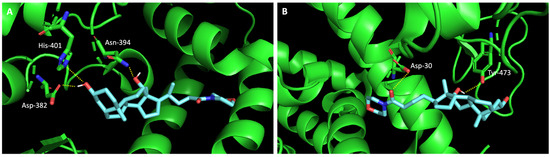 Molecular visualization of bile acid derivative 4 in (A) ACE2 and (B) the RBD of the spike protein. Polar interactions are represented as yellow dashes. Residues involved on those interactions are labeled: Asn—asparagine; Asp—aspartic acid; His—histidine; Tyr—tyrosine.
