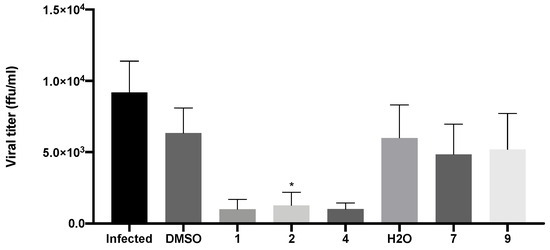 Viral titer measurement in Vero CCL-81 cells 48 h after inoculation with SARS-CoV-2 viral supernatants (obtained from cells previously treated with the IC50 of the tested compounds (or 50 μM for compound 9) and then infected with SARS-CoV-2, MOI = 1). Infected cells without treatment were used as control. Data represents the mean ± SEM of at least three independent experiments. Analysis was performed by GraphPad using the Student t-test. * p < 0.05 relative to the vehicle (DMSO for compounds 1, 2 and 4; H2O for compounds 7 and 9).
