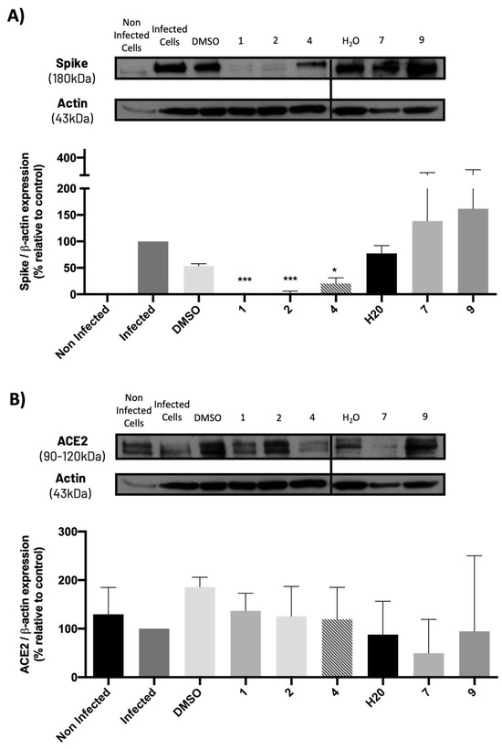Levels of (A) spike and (B) ACE2 proteins in Vero CCL-81 cells treated with the IC50 concentrations of the tested compounds (or 50 μM for compound 9) and infected with SARS-CoV-2 (MOI = 1), analyzed by Western blot. Actin was used as a loading control. Representative blots are shown. Data represents the mean ± SEM of at least three independent experiments. Analysis was performed by GraphPad using the Student t-test. * p < 0.05; *** p < 0.001 relative to the vehicle (DMSO for compounds 1, 2 and 4; H2O for compounds 7 and 9).